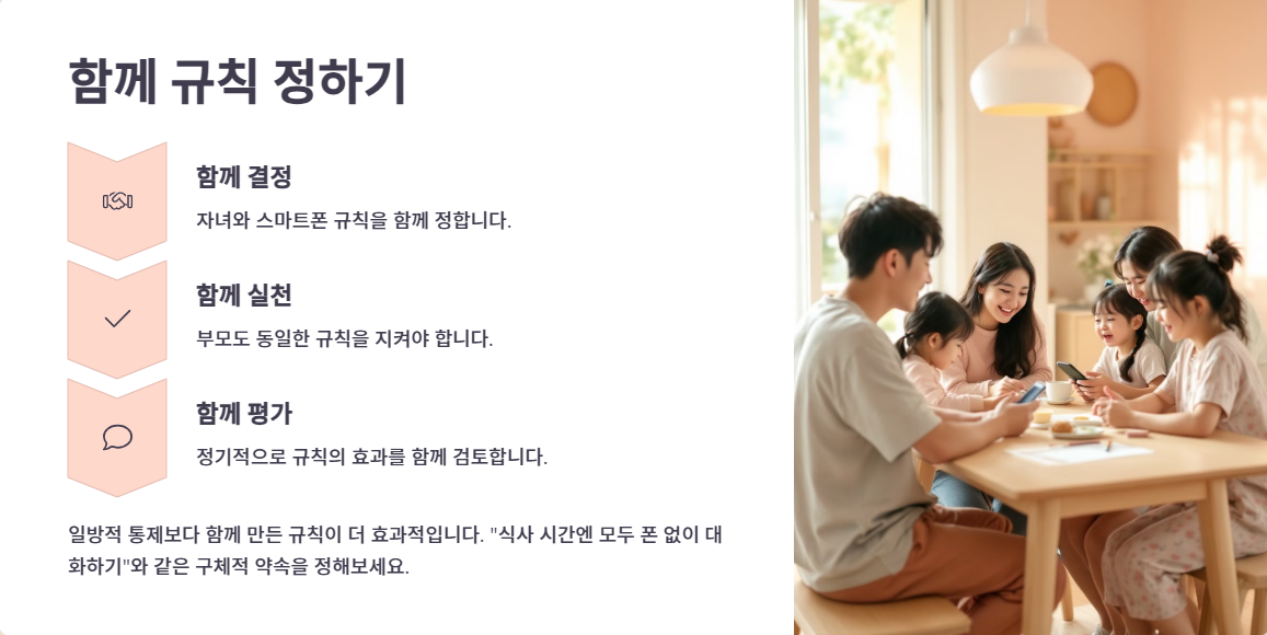 스마트폰 사용 시간을 일방적으로 정하는 것이 아니라 자녀와 함께 규칙을 만들고, 부모도 함께 지키는 모습을 보여주세요. 예: “식사 시간엔 모두 폰 없이 대화하기” 등.